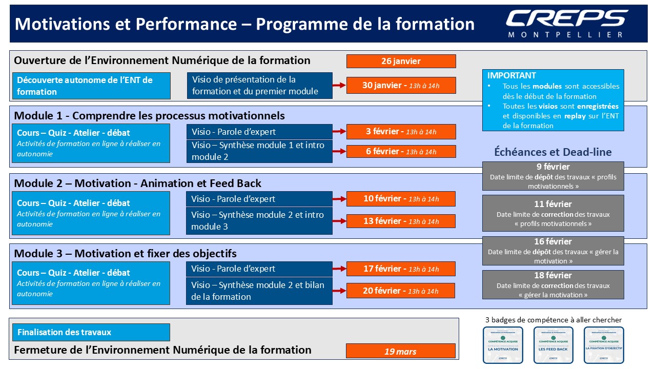 Cette formation tout à distance propose d’alimenter votre réflexion, de répondre à ces questions et de développer les savoir-faire permettant d’intervenir sur la motivation des sportifs.